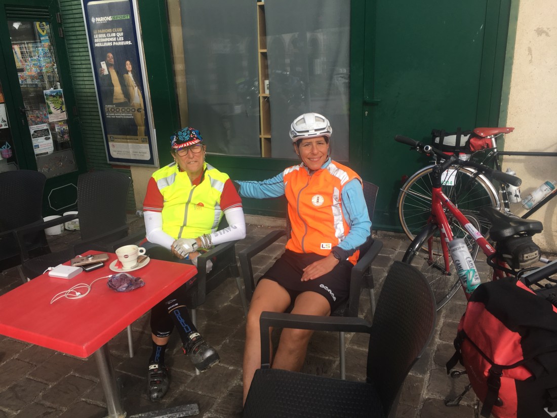 We met our friend Deb Banks at a cafe before Mortange-au-Perche. She was headed back to Paris with a story of a valiant attempt. She had broken her hip just months before the start of PBP. She gave it everything she had and made it to the first time station. Her new goal was to visit the Cathedral at Chartes before returning to the start line near Paris