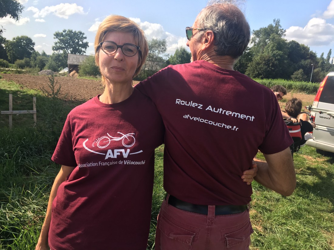 In the town of Gorron, near the third time station, Fougères. We stopped to get a fresh melon to eat. We found a group of recumbent (velocouche) enthusiasts. They were cheering on the PBP participants and watching the real time results on the website for their own rider’s progress. The discussion proceeded, some in English some in French. I casually asked if they knew ‘Les CycloMigrateurs’. There was a resounding affirmative response.
