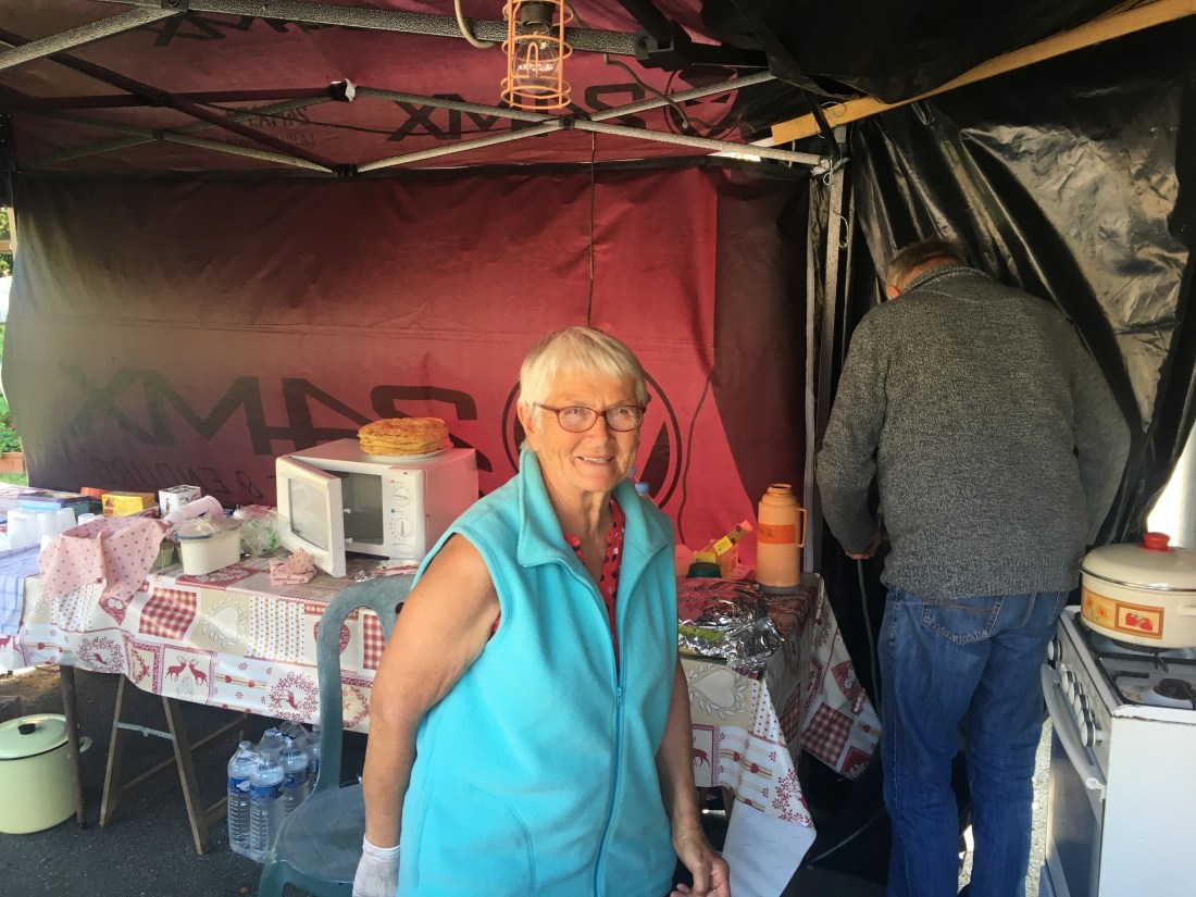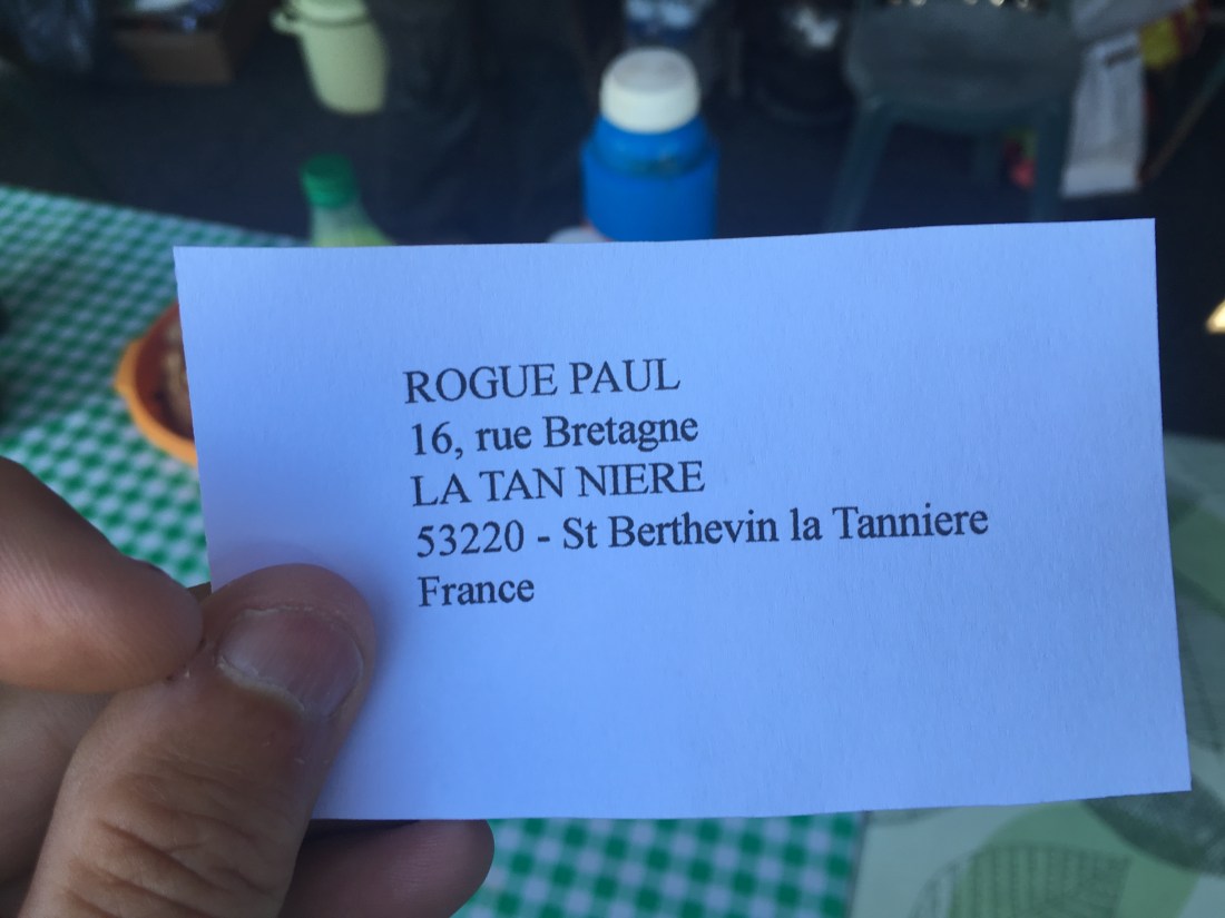 Amongst the hot tips that cyclists share about PBP, a big one is the Crepes place about 10km east of Fougères. This place has been in operation since I started doing PBP in 2003 and probably much earlier than that. The idea is that Paul and his wife (name?) make crepes all night and all day for the duration of PBP. They give them out free with the your promise that you will send a post card from your home. We stopped in for a crepe. We explained that we were not participating. We got the crepe anyway. Good people.