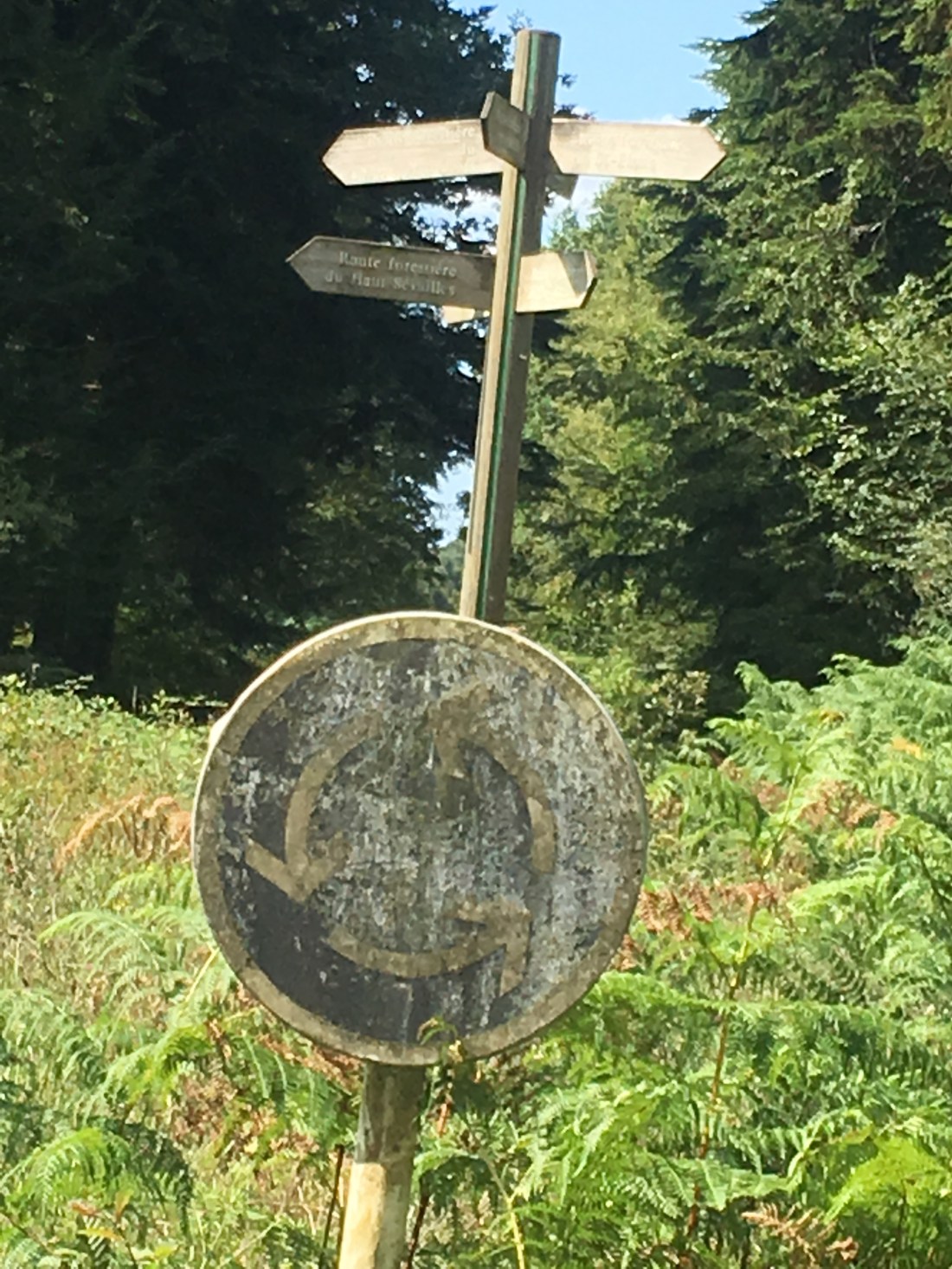 Once we got to Fougères, we left the PBP course and started using a course generated by Komoot, my digital dominatrix. The idea was to take a relatively direct route to Joël and Irene’s place near Rennes. It did generate a good route, but along the way we were directed to a path in the Forest of Liffré. The map shows a legitimate traffic circle. When we found this circle, It was like something from a lost civilization. I had a good belly laugh over this place in the woods. It would be a great candidate for stealth camping.