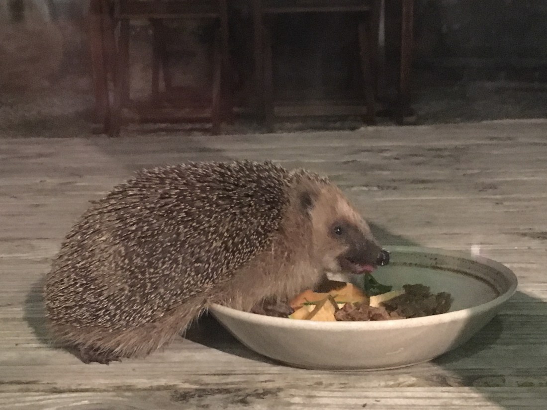 The table scraps from the evening meal are offered to Edmund, the wild hedge hog that lives in the hedges I suppose. Edmund repays the gesture by eating all the slugs in the garden. A good symbiotic relationship.