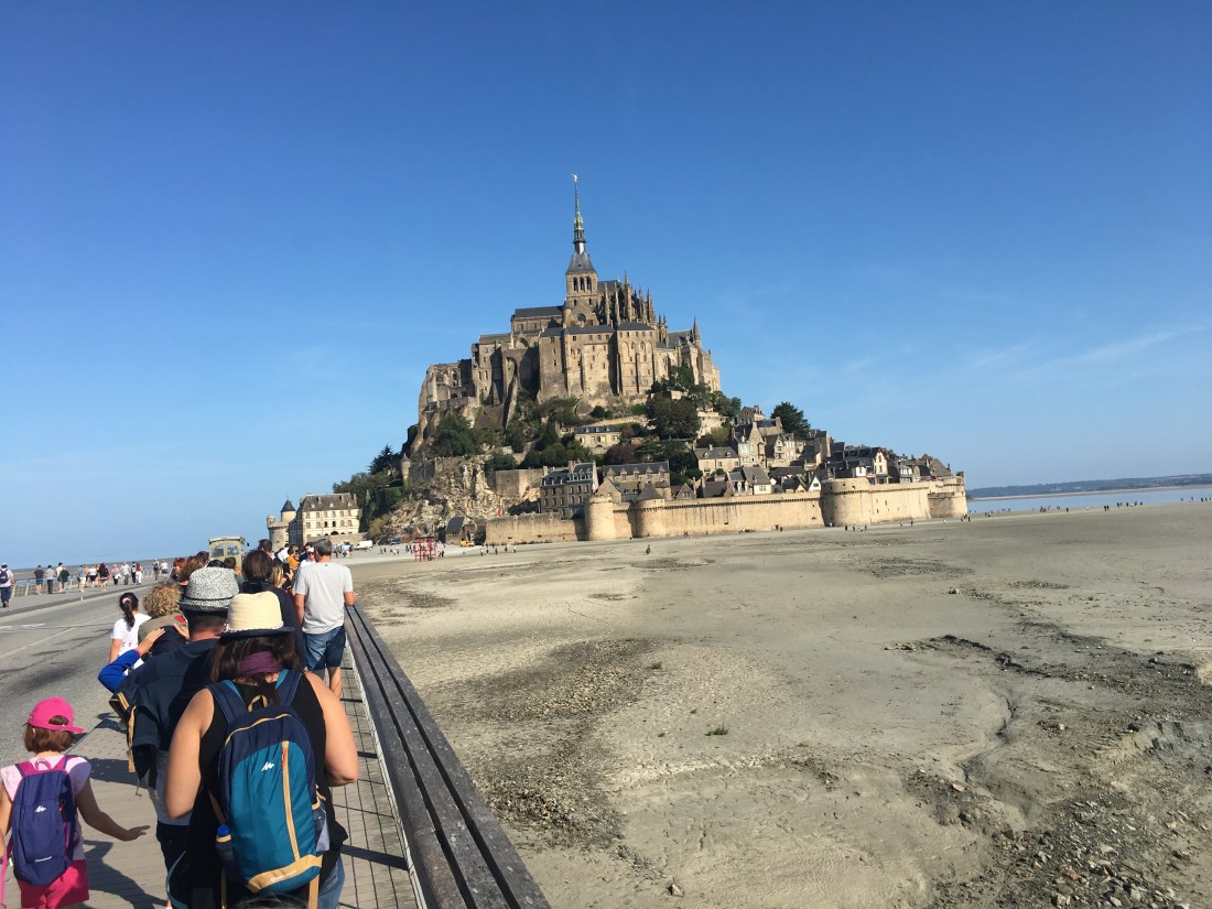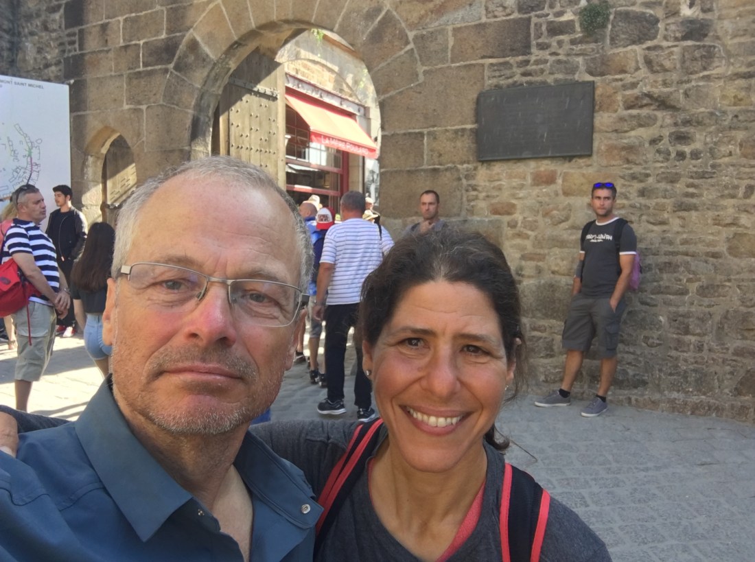 Joël and Irène planned a big day for us. The following day we drove out to the coast to see Mont San Michelle, one of the seven wonders of the world. It is a huge Cathedral built on a large rock out in the ocean near the border of Brittany and Normandy. It has been modified over the centuries. The first building was completed in 740AD. The tides at Normandy are large enough so that at low tide, the island that the Cathedral is standing on is actually no longer an island.