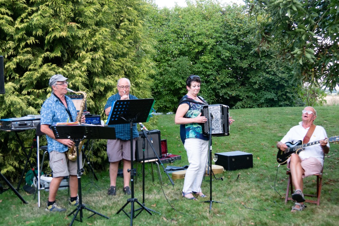 We attended a large party at the home of Noel and Evelynne in the Domagné countryside. I estimate there were 30-50 people there. Some came all the way from Paris for this party. There was a sound stage set up which was well used by many in the crowd. We were lucky to have Yves, a good friend and professional chef. He produced Quiches and Flam Kuchen, amongst many other specialities.