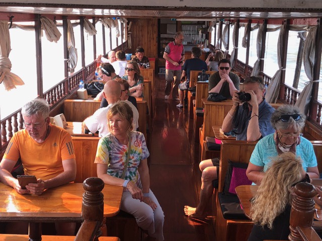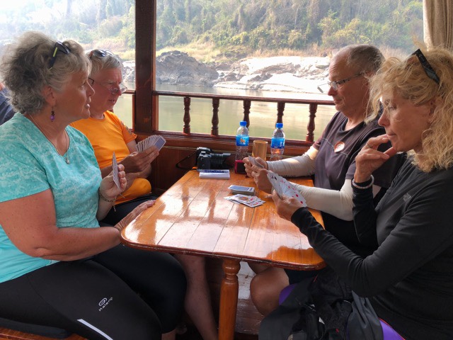 When we first arrived in Laos, we booked a river tour on the MeKong river with Smile Tours. This was very worthwhile. The boat is called a ‘slow boat’. It is 35m long and is powered by a six cylinder turbo diesel. It has more than enough room for 30 people to ride in comfort, even some beds for those who want to sleep. There is a galley which provided fresh cooked meals and snacks along the way. You see many boats of this kind.