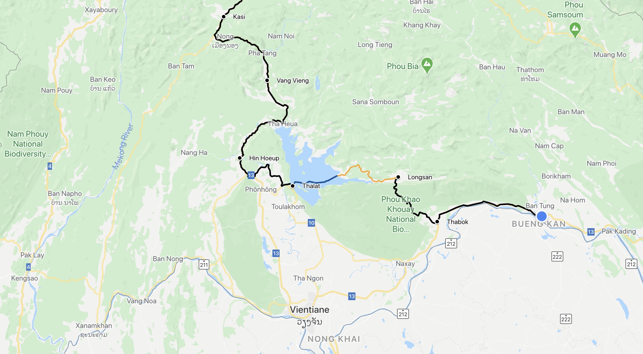 We then headed into the mountains. Here the roads are sketchy and steep. We recruited a local taxi (truck) to haul us through some of the worst part of the road up to Chou Koun. Here at 1400m altitude we stayed warm in our tents through the windy cold night. There were beautiful mountains and many small villages as we proceeded down through the heavily traveled road. Vieng Vang was another tourist town we stayed in on the way to the Nam Ngum Reservoir. The roads in between have many unpaved dirt roads with a lot of large trucks moving through stirring up the dust, to the extent that the trees nearest the road are no longer green. They are the color of dust. These roads have long stretches between villages.