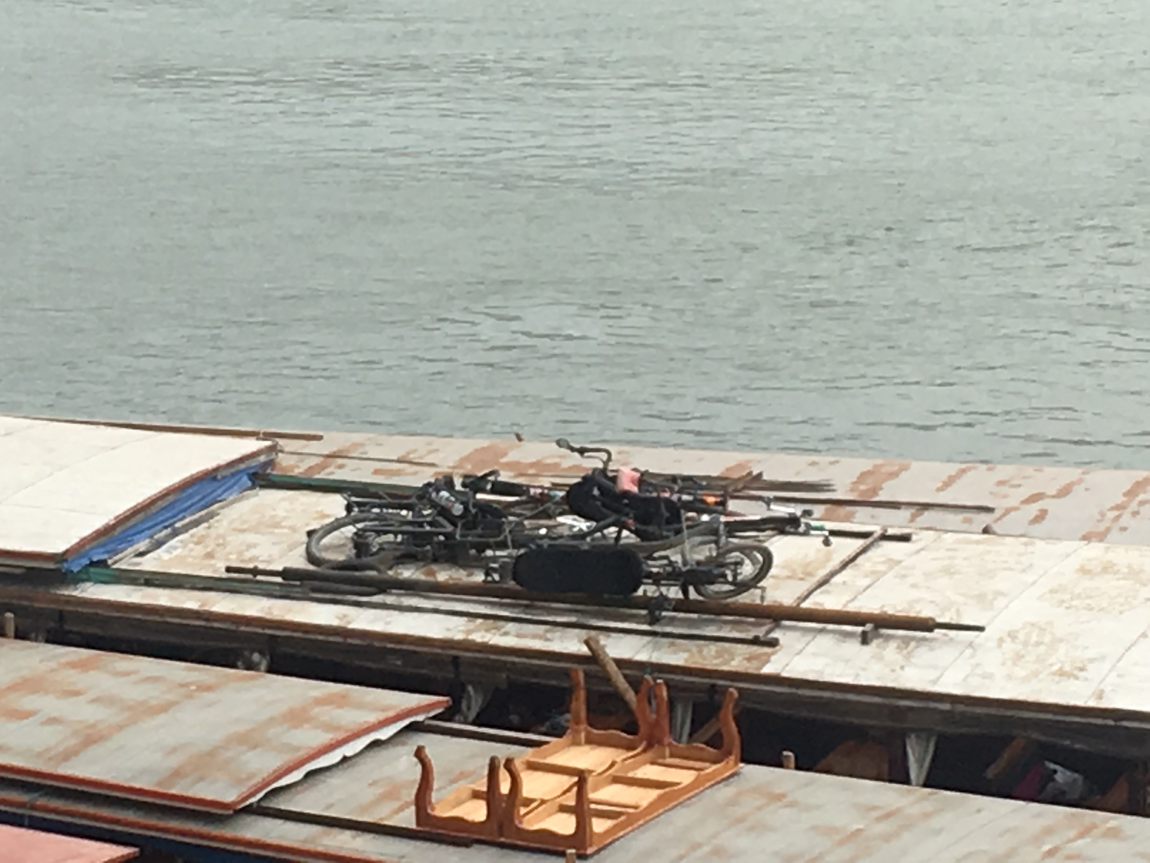 We eventually found it and loaded our bikes on the roof. Along with us was a crowd of locals looking to cross with motorbikes, farm produce, including a rooster. We four were the only western people on the boat. What a contrast with our Smile Tours ride down the Mekong!