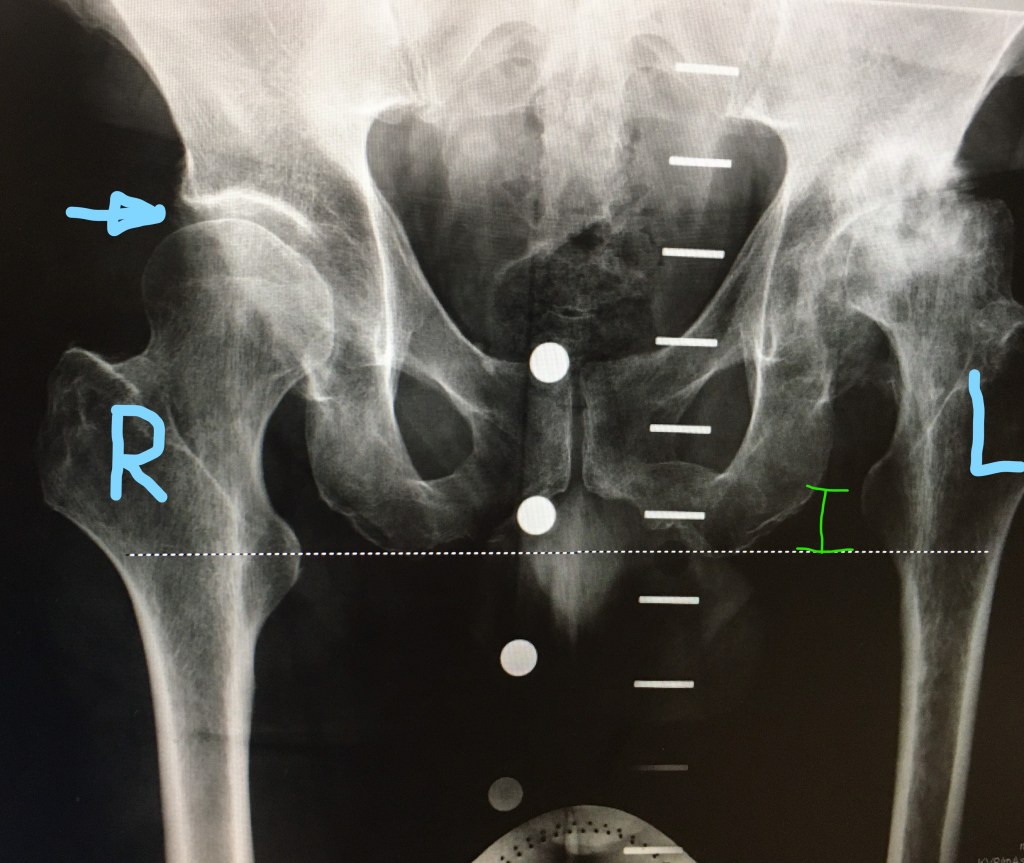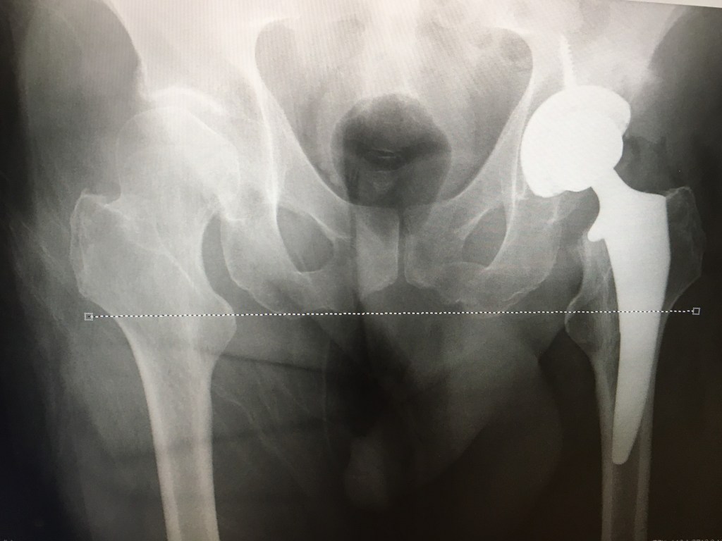 In the pre surgery image the right hip shows a normal layer of cartilage (at the blue arrow). The x-ray image shows this as a gap between the bones. This is completely absent in the left hip. There the cartilage has been abraded away by the arthritic femoral head. As a result the left leg bone had pushed its way up into the hip socket and was bearing bone on bone. As a result, my left leg had become shorter over time, by more than one centimeter. Post surgery, the artificial hip holds the left leg bone in its correct position. As a result, my two legs are once again the same length. The horizontal dashed white line shows that the two leg bones are aligned post surgery. A displacement of one centimeter is seen in the presurgery case (green spacer)