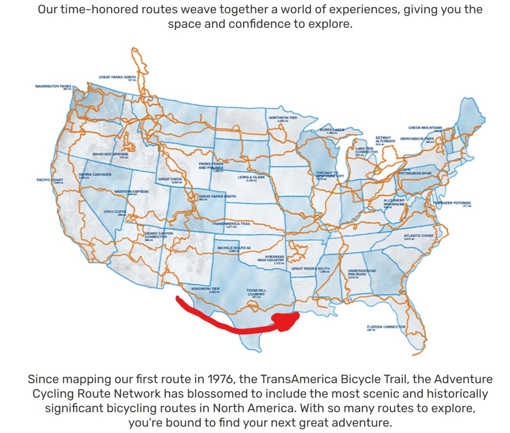 So, It is January. The holidays are over. In order to preserve my status as a Cyclo Nomad, I best be movin’ on. With the help of the Adventure Cycling Association, I mapped out a route across Texas along the Southern Tier.